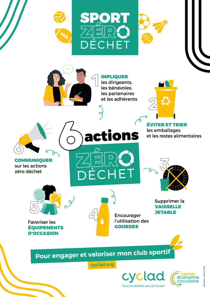 Trier ses déchets c’est bien, réduire ses déchets, c’est mieux ! Afin d’aider les clubs sportifs à réduire leurs déchets, Cyclad a mis en place une charte « Mon club de sport et Cyclad s’engagent ». Elle s’applique sur l’ensemble du site (intérieur et extérieur), au quotidien et lors des événements du club et à tous les niveaux (repas, équipements, hygiène…).