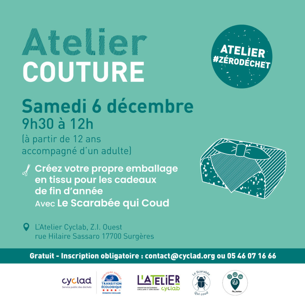 Venez fabriquer vos emballages zéro déchet avec Le Scarabée qui coud, le samedi 6 décembre 2025 de 9h30 à 12h, à Surgères.