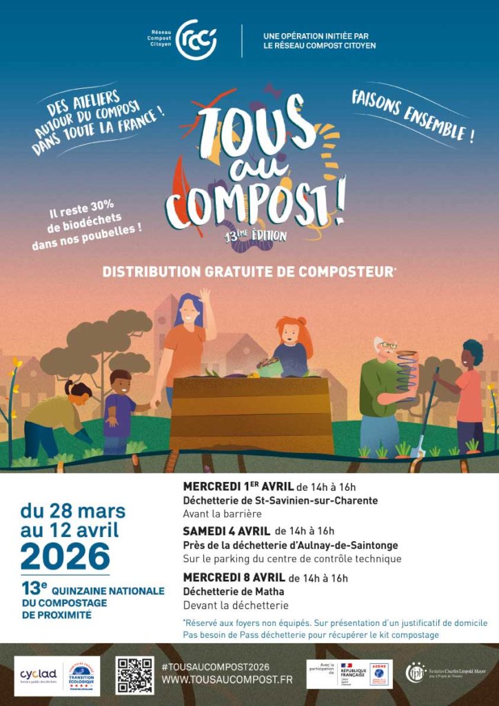 Il reste 30% de biodéchets dans nos poubelles ! Vous aussi, réduisez vos déchets en triant vos biodéchets. Rendez-vous mercredi 1er avril 2026, de 14h à 16h, à la déchetterie de St-Savinien-sur-Charente pour retirer gratuitement votre kit de compostage à domicile.
