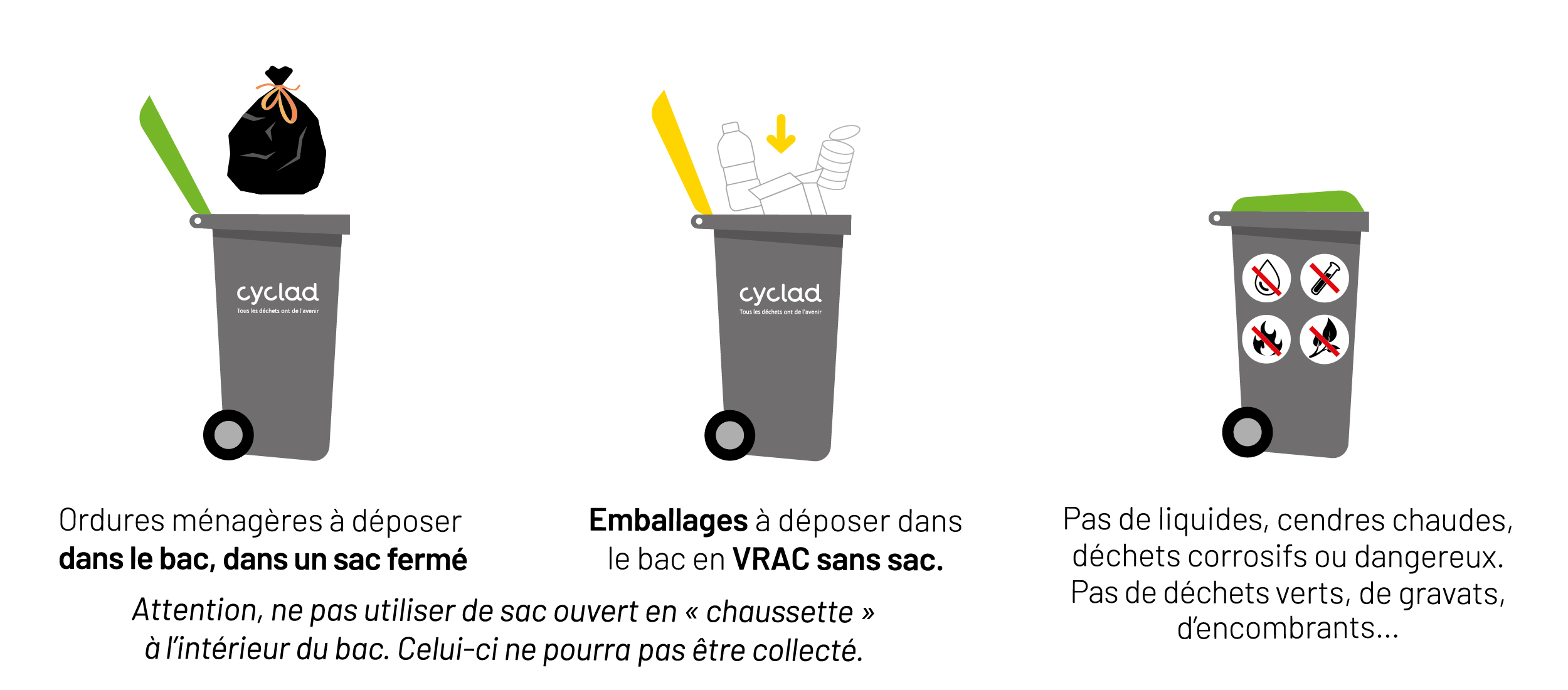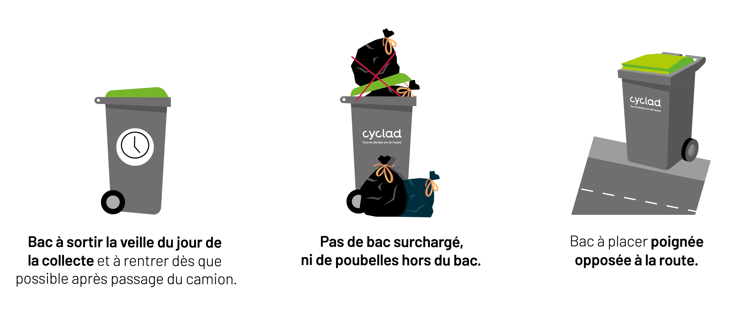 Les bacs mal positionnés ou surchargés ne sont pas collectés. Il est donc nécessaire de bien respecter les consignes suivantes.