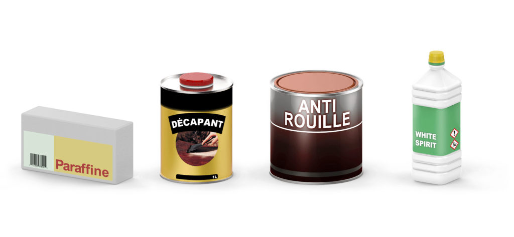 Paraffine, anti-rouille, white-spirit, décapant, solvant et diluant, vaseline, essence de térébenthine, acétone.